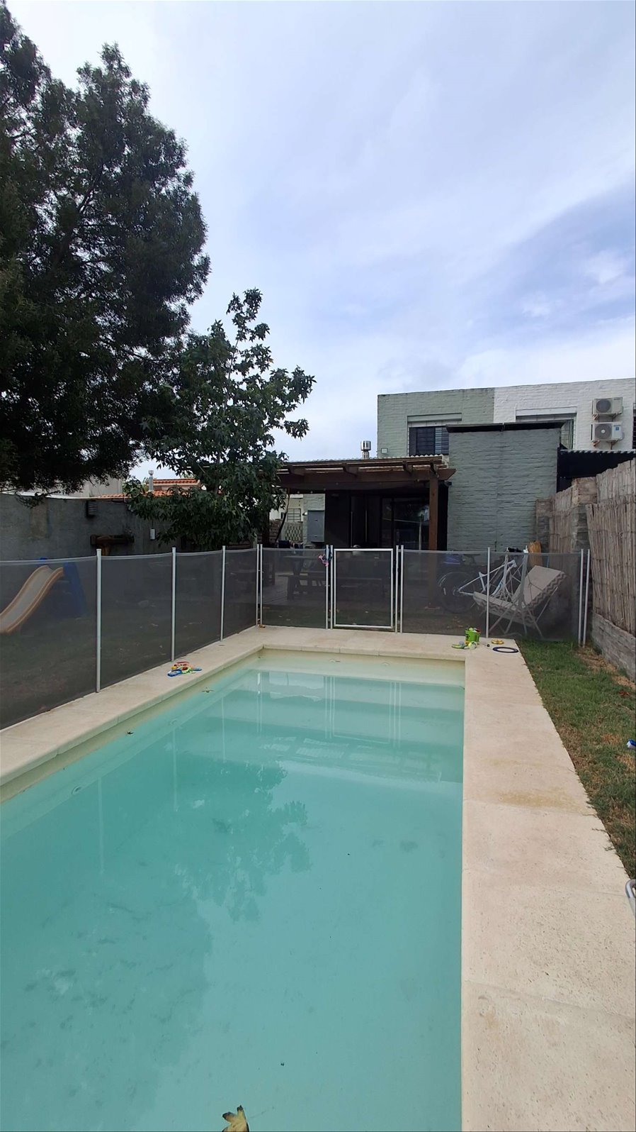 El exterior es uno de sus grandes encantos: jardín verde y arbolado, piscina climatizada y parrillero techado con deck, perfectos para reuniones, verano y vida al aire libre.